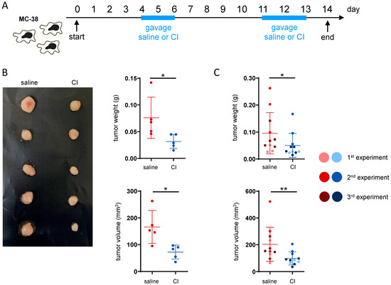 Given the observed impact on the intestinal microbiome composition after the administration of our two probiotics compositions, we evaluated their effect on CRC development. For this purpose, the orthotopic MC-38 CRC cecum injection model was used. In this model, MC-38 colon adenocarcinoma cells are injected into the cecum wall of C57BL/6 mice. CI and CII were administered in two cycles of daily gavages—first from day 4 to 6 and secondly from day 11 to 13 (Supplementary Figure S1A). Control animals received gavages of saline only. In two initial independent experiments, both CI and CII impacted tumor development, as evidenced by decreases in tumor weight and volume. However, CI seemed to induce a more pronounced effect (Supplementary Figure S1B,C). Therefore, we further investigated the anti-tumor potential of CI in the cecum injection model in three independent follow-up experiments, using the same administration scheme and experimental design (Figure 2A). Again, a clear reduction in tumor weight and volume (Figure 2B) was observed, which became statistically significant when the data from all three consecutive experiments were pooled (Figure 2C).