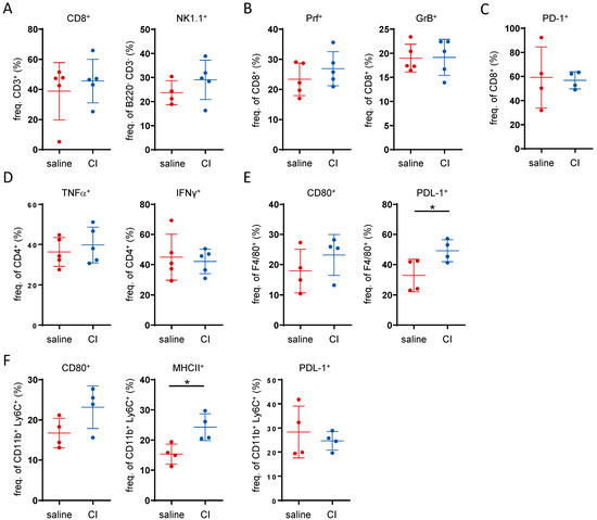Given that CI demonstrated a clear anti-tumor potential, we aimed to assess whether the observed effect was immune-mediated. To this end, the proportions and activation status of intra-tumoral immune cells was analyzed by flow cytometry (gating strategies are shown in the Supplementary Figure S2). With regard to the overall frequency of B-cells, T-cells and NK cells, only a minor increase in CD8+ cells and NK1.1+ cells in the tumor tissue was visible in the CI-treated group (Figure 3A and Figure S3A). Among the CD8+ cytotoxic T-cells, there was a slight trend toward an increase in perforin-positive (Prf+) cells. However, no differences were observed in granzyme B (GrB+) levels (Figure 3B) or T-cell exhaustion, as indicated by PD-1 staining (Figure 3C). In pro-inflammatory CD4+ T-cells, a slight tendency toward an increase in TNF-α but not IFN-γ (Figure 3D) levels was observed. In CD8+ T-cells, no difference in TNF-α or IFN-γ levels was observed upon CI administration. In fact, nearly all CD8+ T-cells were positive for both cytokines regardless of CI administration (Supplementary Figure S3B). No differences in myeloid cell infiltration into the tumor tissue were observed, as the frequency of neutrophils, macrophages, monocytes and dendritic cells did not differ between the treatment groups (Supplementary Figure S3C). However, in CI-treated animals, there was an increase in CD80-expressing macrophages and a significant induction of PDL-1 production (Figure 3E). In monocytes, increased surface expression levels of CD80 and MHCII were observed in CI-treated animals, while PDL-1 expression was slightly reduced (Figure 3F). To further explore potential mechanisms, untargeted metabolomics analysis of the serum was conducted alongside flow cytometry analysis of the immune cells. The relatively close clustering of both treatment groups in the PCA plot suggests that the overall differences in their serum metabolomic profiles were minimal (Supplementary Figure S4, Table S2). The butyrate level was not altered or correlated with tumor load (Supplementary Figure S4). Collectively, these findings suggest that the anti-tumor activity of CI is not primarily driven by immune-mediated or metabolomic alterations.