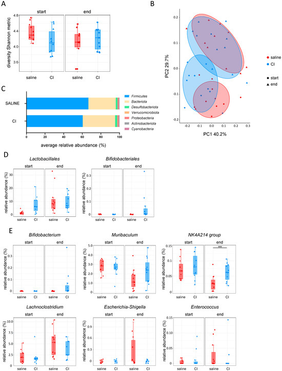 To study the impact of CI on the intestinal microbiome in the context of CRC, 16S sequencing of fecal samples (sampled at the start and at the end of each experiment) from control and CI-treated mice was performed, combining data from the three cecal injection experiments with CI. At the start of the experiment, the CI group exhibited slightly lower Shannon diversity indices. However, by the end, alpha diversity increased in CI-treated mice, while it decreased in the saline group (Figure 4A). In terms of beta diversity, there was a substantial overlap between the saline and CI groups at the start of the experiment. However, by the end, the saline group became more distinct, indicating that probiotic administration altered the microbial composition over time (Figure 4B, Table S1). At the phylum level, Firmicutes were less abundant in the CI-treated group, while Bacteroidota increased, indicating a shift in microbiome composition (Figure 4C). When examining the abundance of the administered probiotics, Lactobacillales abundance increased over time in both groups, whereas Bifidobacteriales appeared only in the CI-treated animals (Figure 4D). In CI-treated mice, Bifidobacterium was clearly present at the genus level, along with the stabilization of Muribaculum and the NK4A214 group (Figure 4E). The abundance of these genera, which are highly associated with a healthy gut microbiome, notably decreased in the saline-treated group during CRC progression. Furthermore, CI administration inhibited the increase in Lachnoclostridium, was associated with pro-tumorigenic processes in CRC, and prevented the rise of pathogenic bacteria such as Escherichia-Shigella and Enterococcus (Figure 4E).