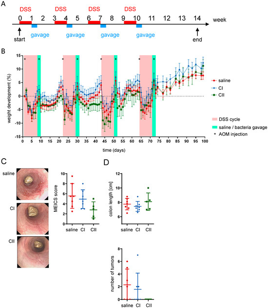 To validate the anti-tumor potential of the probiotics, the therapeutic effects of both compounds were tested in the azoxymethane/dextran sodium sulfate (AOM/DSS) inflammation-dependent model of colitis-associated cancer. In this model, tumor development is induced by administering the chemical carcinogen AOM in combination with DSS, which triggers chronic intestinal inflammation. The experiment involved four cycles of DSS administration in drinking water, each lasting 7 days, which was followed by a 14-day recovery period with regular drinking water (no DSS). After the final DSS cycle, the animals underwent a 4-week recovery period. In each cycle, AOM was administered via intraperitoneal injection on days 1 and 9 (Figure 5A). At the end of each DSS cycle, mice received daily gavage of saline, CI or CII for 3 consecutive days. Throughout the experiment, mice in each group showed weight loss in response to DSS and AOM treatments but quickly regained weight during phases with regular drinking water (Figure 5B). To evaluate the impact of probiotics on intestinal inflammation, colonoscopy was performed at the end of the experiment. The murine endoscopic index of colitis severity (MEICS) score indicated that CI had a limited effect, while CII reduced colonic inflammation (Figure 5C). While both compositions had only little effect on colon length (which typically shortens upon the presence of intestinal inflammation), mice treated with CII did not develop tumors in the colon (Figure 5D).