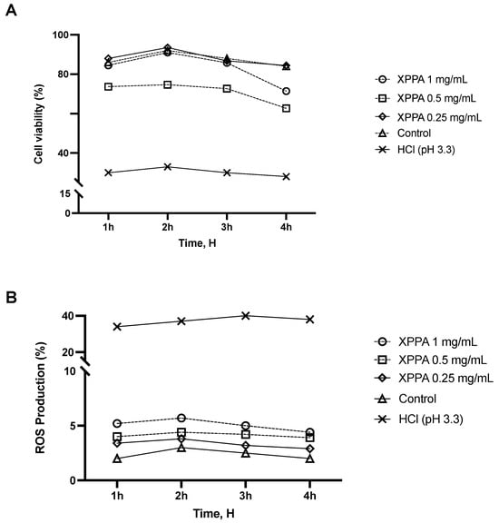 Reactive oxygen species (ROS) are associated with epithelial damage in reflux esophagitis and GERD []. An additional time-dependent study was conducted using the same in vitro model to assess the potential impact of XPPA on ROS production. The detrimental effects of HCl on ROS production observed in positive controls (p < 0.05) were mitigated by all concentrations of XPPA (Figure 1B). Indeed, a statistically significant difference in ROS production was observed between positive controls and XPPA-treated cells (p < 0.05 for all concentrations, at all time points. Concerning the concentrations tested, it would appear that there is a dose-dependent effect inversely proportional to concentration; indeed, XPPA 1 mg/mL, although still inducing beneficial effects compared to the harm condition (p < 0.05), induces a smaller effect than either of the other two lower concentrations in both parameters analyzed. In line with this, XPPA 0.5 mg/mL induces better effects than the 1 mg/mL concentration, but still slightly lower than XPPA 0.25 mg/mL.