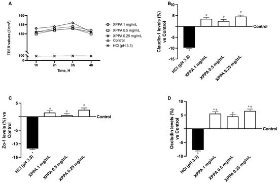 The expression of TJ proteins was analyzed to support this result further. Claudin-1, occludin, and ZO-1 levels showed a strong decrease upon HCl treatment, compared to untreated cells (p < 0.05). In contrast, all XPPA concentrations restored the physiological expression of all three junction proteins (Figure 2B–D).