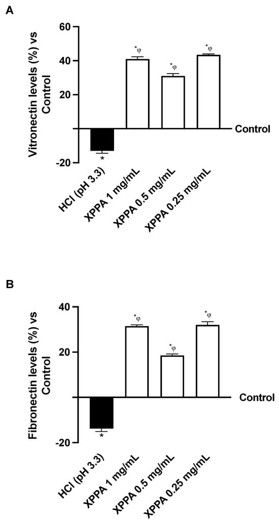 The effects of XPPA on cellular adhesion capacity in hyperacidic conditions were evaluated. Specifically, two extracellular matrix glycoproteins known to be involved in adhesion, vitronectin and fibronectin, were quantified using ELISA to examine the effects of gastric acid on cell adhesion to the extracellular matrix (Figure 3). As expected, HCl determined a decrease in the expression of vitronectin and fibronectin, indicating a loss of adhesion compared to the negative control (p < 0.05). Notably, XPPA re-established the expression levels of both glycoproteins, possibly indicating the restoration of cellular adhesion to the ECM (p < 0.05 vs. both positive and negative controls).
