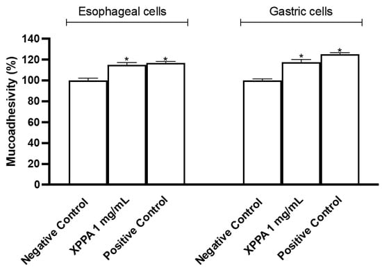 Mucoadhesion is a crucial feature of GERD treatments, as it allows the formulation to stay in contact with gastroesophageal tissues for a prolonged time. The mucoadhesive property of XPPA was tested both in gastric and esophageal cells (Figure 4). The concentration evaluated was chosen based on the cell viability test. Indeed, the tested product showed significant mucoadhesive properties on both esophageal and gastric cells, compared with the negative control (p < 0.05).