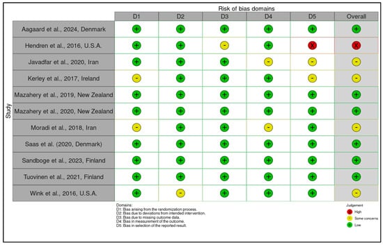 - Sterne, J.A.C.; Savović, J.; Page, M.J.; Elbers, R.G.; Blencowe, N.S.; Boutron, I.; Cates, C.J.; Cheng, H.-Y.; Corbett, M.S.; Eldridge, S.M.; et al. RoB 2: A Revised Tool for Assessing Risk of Bias in Randomised Trials. BMJ 2019, 366, l4898. [Google Scholar] [CrossRef]