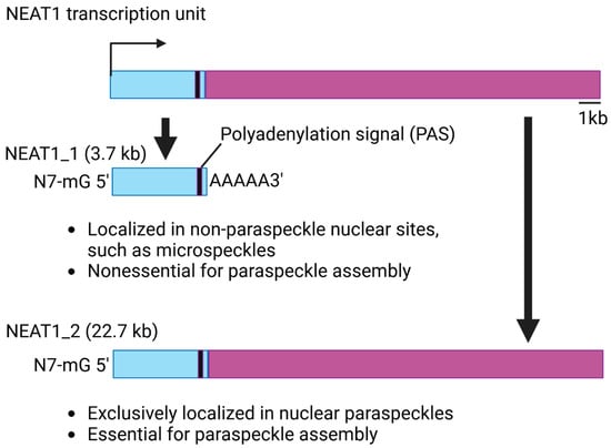 - Isobe, M.; Toya, H.; Mito, M.; Chiba, T.; Asahara, H.; Hirose, T.; Nakagawa, S. Forced isoform switching of Neat1_1 to Neat1_2 leads to the loss of Neat1_1 and the hyperformation of paraspeckles but does not affect the development and growth of mice. RNA 2020, 26, 251–264. [Google Scholar] [CrossRef] [PubMed]