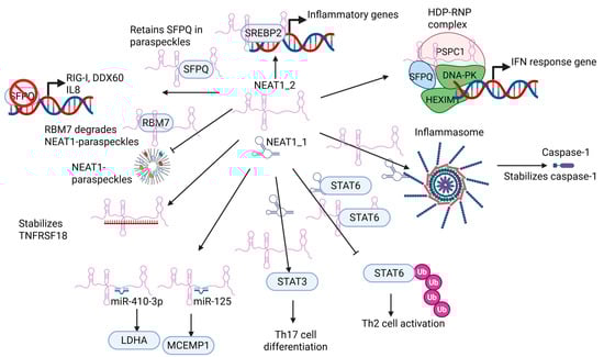 - Chen, S.; Wang, J.; Zhang, K.; Ma, B.; Li, X.; Wei, R.; Nian, H. LncRNA Neat1 targets NonO and miR-128-3p to promote antigen-specific Th17 cell responses and autoimmune inflammation. Cell Death Dis. 2023, 14, 610. [Google Scholar] [CrossRef]
