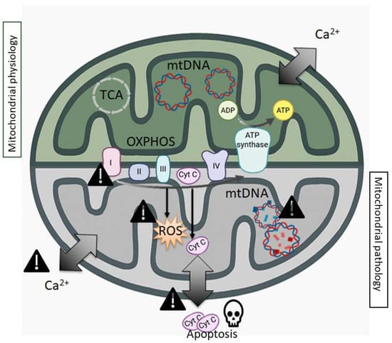Figure 1. Upper half, mitochondrial physiology with electron transport chain and OXPHOS in the inner mitochondrial membrane, Krebs cycle providing molecules with reducing power to feed the mitochondrial respiratory chain, and intact mitochondrial genomes, located in the mitochondrial matrix. Bottom half, mitochondrial pathology with impaired mtDNA molecules, alterations in calcium homeostasis, cytochrome c release inducing apoptosis, and dysfunction of the OXPHOS generating ROS. The black warning symbols in the figure indicate the main points of dysfunction within the pathological context (at the bottom). ADP, adenosine diphosphate; ATP, adenosine triphosphate; Ca2+, calcium; CoQ, coenzyme Q; cyt C, cytochrome c; H+, hydrogen protons; H2O, water; mtDNA, mitochondrial DNA; NAD+, nicotinamide adenine dinucleotide; NADH, reduced form of nicotinamide adenine dinucleotide; O2, oxygen; OXPHOS: oxidative phosphorylation system; ROS: reactive oxygen species; TCA, tricarboxylic acid cycle.