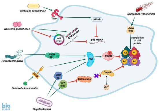 Bacteria antagonize p53 protein by mechanisms of its destabilization or by reducing expression of its mRNA. Bacteria produce proteins (bps), which interact with cellular molecules interfering with the p53 pathway. For instance, one of the proteins (IpgD) produced by S. flexneri promotes activation of AKT kinase, which phosphorylates and activates MDM2, which is a major negative regulator of p53 inducing its degradation. Another S. flexneri protein (VirA) induces proteolysis of calpastatin, which is a negative regulator of calpain. Liberated calpain snips off the N-terminus of p53. Other bacteria also act through the activation of AKT. For instance, in H. pylori, this function is played by the CagA protein. On the other hand, C. trachomatis activates EGFR (epidermal growth factor receptor), which by its natural signaling pathway stimulates AKT. N. gonorrhoeae arrests the cell cycle and induces DNA breaks in host cells, which in normal conditions would activate p53, but infection with this bacterium, by an unknown mechanism, reduces expression of p53 mRNA. K. pneumoniae activates Toll-like receptor 4 (TLR4), which indirectly activates the NF-κB pathway, which through mediators causes the destabilization of p53 mRNA. The only known bacterium that apparently activates p53 is Salmonella Typhimurium, which through its AvrA protein promotes p53 acetylation, which is associated with its stabilization and activation.