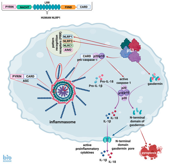 The p53 activates at least three genes, which encode the components of inflammasomes. A simplified model of pro-inflammatory caspase-1 activation. Inflammasomes are multiprotein complexes promoting inflammation. They consist of pro-caspase-1 (localized centrally) linked to various pattern recognition receptors (PRRs, localized peripherally) by the ASC protein. Pro-caspase-1 and ASC are linked through CARD domains, whereas ASC and PRRs are linked through PYRIN domains. Binding of a ligand (e.g., a bacterial molecule) to a PRR induces a series of molecular alterations, which lead to the cleavage of pro-caspase-1 into p10 and p20 domains, which as a dimer of dimers form active-caspase-1. This enzyme cleaves inactive pro-inflammatory IL-1β and IL-18 into active molecules. Moreover, caspase-1 cuts gasdermin proteins, whose N-terminal fragments form pores within the plasma membrane. These pores are used by active cytokines to escape into extracellular space. Moreover, the pores contribute to cell swelling and death, which is called pyroptosis. Interestingly, NLRP1 can directly interact with pro-caspase-1 through the CARD domains of both proteins. The NLRP1 inflammasome is poorly studied, but it can be the predominant inflammasome in human barrier cells. The genes coding these components of the inflammasomes (pro-caspase-1, NLRP1, and NLRP3) are directly activated by p53. Moreover, p53 activates a gene for one of the gasdermins—GSDME.