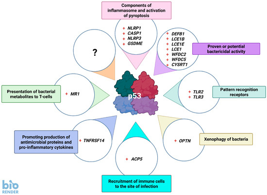In this review, we will show how p53-activated genes could impede the life cycles of bacteria. We will present both well-established facts and less documented models that require further investigation. The role of p53 as an immune regulator was covered by recent reviews [3,4]. In this paper, for each selected gene we will briefly present the strength of the evidence that it is controlled by p53 and what is or might be the mechanism of its antibacterial activity. We were guided in this selection by our transcriptomic analysis, which revealed numerous immunity genes possibly regulated by p53 [5]. First, however, we will summarize the main characteristics of the p53 pathway, which may be relevant to understanding its plausible antibacterial activity.