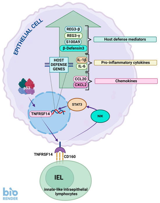 The antibacterial role of p53, which is mediated by up-regulation of the TNFRSF14 gene. This gene codes the cell surface protein, which can either act as a ligand or as a receptor depending on the cellular context. In this example, TNFRSF14 protein acts as a receptor for CD160 protein expressed on innate-like intraepithelial lymphocytes. Stimulation of the receptor by CD160 protein triggers a cascade of events involving the activation of NIK kinase (NF-κB-inducing kinase), which phosphorylates and activates the STAT3 protein. This transcription factor induces a plethora of host defense genes, e.g., the gene for β-defensin 3, the genes for pro-inflammatory cytokines and chemokines.