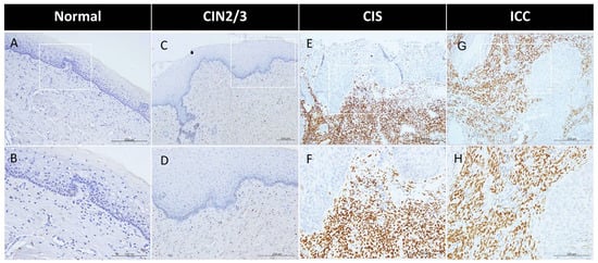 This study comprehensively examined formalin-fixed paraffin-embedded (FFPE) tissue samples, including CIN2/3, CIS, and ICC. The Research Ethics Committee of Hualien Tzu Chi Hospital, Hualien, Taiwan, approved the two protocols of this study. ICC specimens were retrieved from patients with cervical cancer who underwent radical hysterectomy at Hualien Tzu Chi Hospital between 2000 and 2010 (IRB104-151-A). Normal cervical specimens were obtained from patients who underwent total hysterectomy because of uterine myoma or adenomyosis. CIN2/3 and CIS specimens were collected during cervical biopsies and conizations at Hualien Tzu Chi Hospital from 2015 to 2017 (IRB104-100-A). A senior pathologist sectioned these paraffin blocks to confirm the diagnoses and adequacy of the stromal part. Cases that did not meet the diagnoses or lacked an adequate stromal component were excluded from the study. Clinical characteristics, including patient’s age, parity, and menopausal status, were also reviewed in the study.