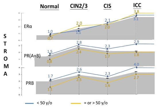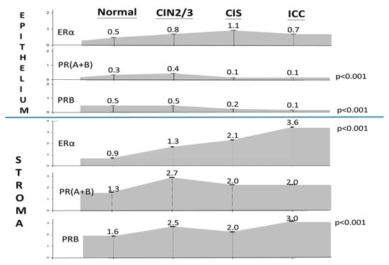 The PR gene encodes two isoforms of the PR protein: PRA and PRB. The E2-bound ERα upregulates the expression of both isoforms by acting on the PR promoter [,]. Indeed, the stromal expression levels of ERα and PRs were highly correlated in individual normal, CIS, and ICC specimens, with correlation coefficients of 0.528, 0.607, and 0.745, respectively (p < 0.001 for each). However, in CIN2/3 specimens, the ERα/PR correlation was disrupted (r = 0.292, p = 0.072) (Table 2).