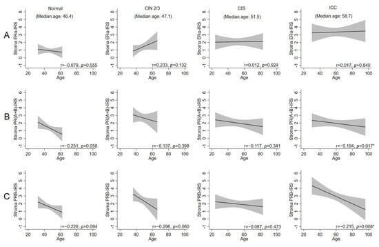 We determined whether the expression of hormone receptors changes with age (Figure 3A–C). In the stroma, there was a statistically non-significant trend in age-related reduction in PRB levels in normal and CIN2/3 specimens. This trend was lost in CIS but became statistically significant and reappeared in ICC (Figure 3C). The age-related changes in PRs were pronounced, particularly for PRB in ICC. Pearson’s correlation coefficient (r) decreased from 0.226 and 0.296 in the normal and CIN2/3 specimens to 0.087 in CIS specimens and then increased to 0.215 in ICC specimens (p = 0.008).