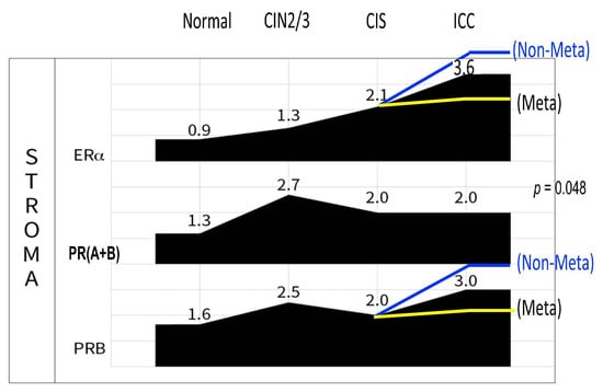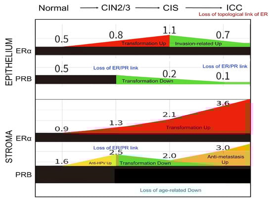 The development of the Müllerian epithelium is regulated by estrogen and progesterone through paracrine mechanisms, which necessitate the crosstalk of their receptors across the basement membrane [,]. The PR changes in the stroma of the transforming cervix may reflect different needs in multistage carcinogenesis. It is speculated that in the normal to CIN2/3 stage, stromal PR increases to combat HPV infection and transformation. In the CIN2/3–CIS progression stage, a decrease in PR is required to advance the transformation. We observed a PR decrease in the stroma and epithelium during this transition (Figure 2). In the CIS stage, wherein the full thickness of the epithelium is transformed, the new topological interaction between the epithelium and stroma is related to invasion and anti-invasion activities, respectively. Meanwhile, the oncogenic ERα in the stroma further increases (Figure 5). However, further studies are warranted to prove this speculation.