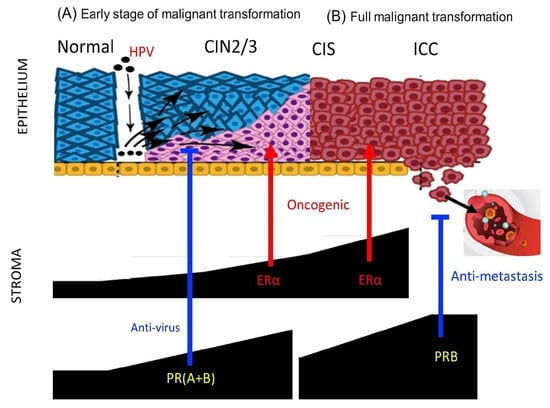 Possible roles of stromal P4/PR in HPV infection and cervical cancer progression. (A) At the early stage of malignant transformation (intraepithelial neoplasia), stromal progesterone and PRs promote antiviral innate immunity to counteract HPV infection, whereas stromal ERα is necessary for HPV-induced carcinogenesis. (B) After complete transformation or in invasive cancer, upregulated stromal PRB inhibits hematogenous metastasis. In cases where stromal PRs are not upregulated or are lost, distant metastasis may develop, which is associated with poor prognosis. Symbols: blue line: inhibition, red arrow: activation.