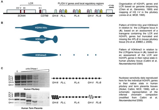 - Nickel, B.E.; Cattini, P.A. Nuclease sensitivity of the human growth hormone-chorionic somatomammotropin locus in pituitary and placenta suggest different mechanisms for tissue-specific regulation. Mol. Cell Endocrinol. 1996, 118, 155–162. [Google Scholar] [CrossRef] [PubMed]