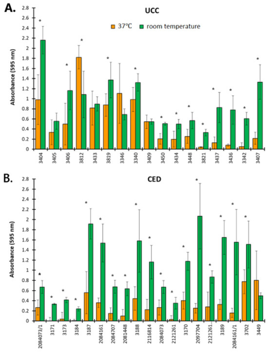 Figure 1. The ability to form biofilm by coagulase-negative staphylococci (CoNS). Strains isolated as blood culture contamination (BCC) from a patient of the University Clinical Center (UCC, (A)) and the Clinical Emergency Department (CED, (B)) in Gdansk. The results are obtained with crystal violet staining. Asterisks indicate statistically significant differences between the results obtained for strains at 37 °C and room temperature.