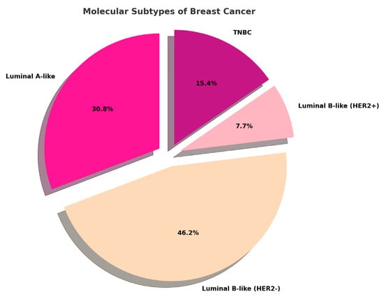 The study population consisted of 26 invasive breast cancer cases from female patients aged 41 to 87 years (mean ± SD: 59.8 ± 3.0 years). Following histopathological analysis, the tumors were classified as follows: No Special Type (NST) invasive breast carcinoma (n = 24), lobular invasive carcinoma (LIC) of pleomorphic type (n = 1), and mixed invasive carcinoma (ductal and lobular components) (n = 1). According to molecular classification based on IHC surrogates [], the distribution of cases is shown in Figure 1.