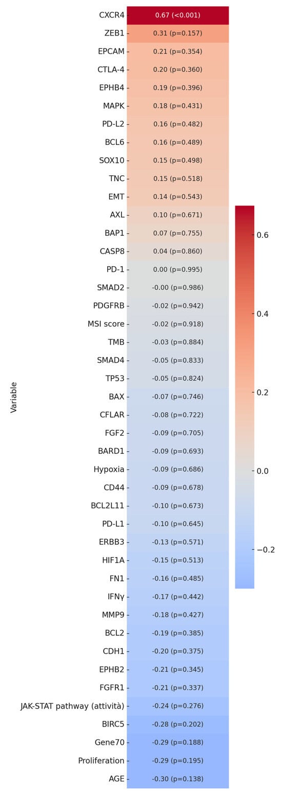 To identify the molecular traits associated with Hg bioaccumulation in breast cancer tissues, fresh-frozen counterparts of the FFPE samples analyzed by histology were subjected to molecular investigations (WGS. RNA seq). These analyses aimed to assess the specific gene mutations, tumor mutational burden (TMB), microsatellite instability (MSI), gene expression, and molecular profiles associated with cancer hallmark gene signatures, including the epithelial–mesenchymal transition (EMT) [], hypoxia [], Gene 70 [,], and proliferation [,]. Additionally, molecular pathways underlying cancer mechanisms, such as JAK-STAT and MAPK, were examined. Among all the genes and molecular signatures analyzed, Hg accumulation showed a significant positive correlation with CXCR4 expression (p < 0.001). The correlation matrix in Figure 3 illustrates the associations among all investigated variables.