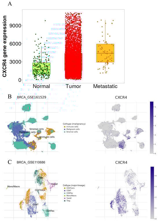 Gene chip data were utilized to quantify CXCR4 expression, and differential expression analysis was performed to compare tumoral and metastatic tissues against normal ones. This analysis revealed an increase in CXCR4 expression in both tumoral and metastatic lesions (Figure 4A), highlighting the potential role of CXCR4 in cancer progression (Kruskal–Wallis test p < 0.0001; normal vs. tumor p < 0.0001; normal vs. metastatic p < 0.0001; tumor vs. metastatic p < 0.0001). Single-cell transcriptomic analysis revealed that CXCR4 expression in breast-infiltrating carcinomas is primarily associated with immune cells, although it is also present in malignant cells (Figure 4B). Within the tumor immune infiltrate, CXCR4 is mainly expressed by both CD4+ and CD8+ lymphocytes (Figure 4C).