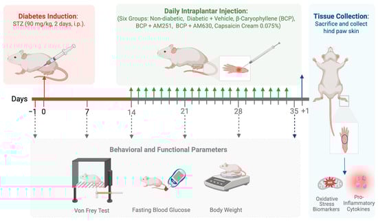 Schematic representation of the experimental timeline. This diagram illustrates the experimental timeline, outlining the procedures for diabetes induction and BCP treatment. Mice were induced with diabetes via STZ injections (90 mg/kg, i.p.). Starting on day 14, daily intraplantar (i.pl.) injections of β-Caryophyllene (BCP, 27 µg) were administered for 21 days to six groups: non-diabetic, diabetic + vehicle, diabetic + BCP, diabetic + BCP + AM251 (CB1 antagonist), diabetic + BCP + AM630 (CB2 antagonist), and diabetic + topical analgesic cream with capsaicin 0.075% (Zostrix® HP). Behavioral and functional parameters, including mechanical allodynia (assessed by the Von Frey test), fasting blood glucose levels, and body weight, were evaluated at baseline (before STZ injection) and then on days 7, 14, 21, 28, and 35. On day 35, mice were sacrificed, and hind paw skin was collected to analyze oxidative stress biomarkers and pro-inflammatory cytokines. The figure was created with BioRender.com.