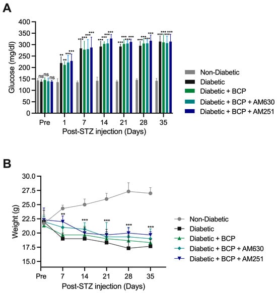 Effects of STZ-induced diabetes and BCP treatment on blood glucose and body weight. (A) STZ-induced diabetes resulted in glucose levels exceeding 250 mg/dL. BCP treatment, either alone or with AM251 (CB1 antagonist) or AM630 (CB2 antagonist), did not significantly alter glucose levels in diabetic mice. Non-diabetic controls maintained normal glucose levels. (B) Diabetic mice showed significant weight loss starting on day 7 post-STZ injection, with this reduction persisting throughout the study. BCP and antagonist treatments had no significant impact on body weight. Data are presented as mean ± SEM (n = 8 per group). Statistical analysis: Two-way ANOVA with Tukey’s post-hoc test. ns, not significant, ** p < 0.01, *** p < 0.001 vs. non-diabetic controls.