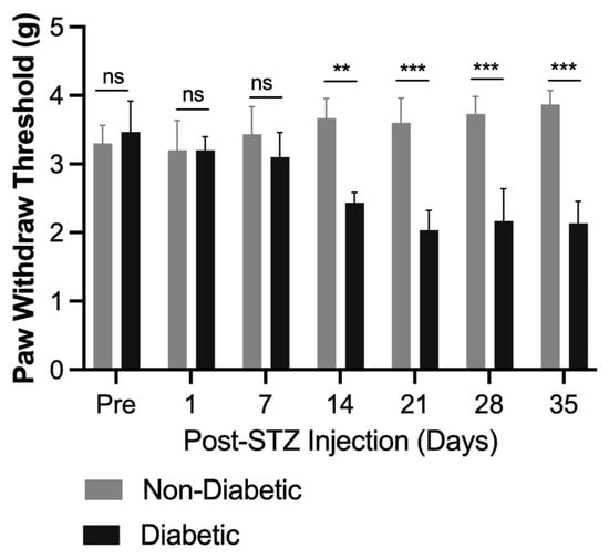 Time course of mechanical withdrawal thresholds in STZ-induced diabetic mice. Mechanical allodynia was assessed using von Frey filaments in STZ-induced diabetic and non-diabetic control mice. Diabetic mice exhibited a significant reduction in paw withdrawal thresholds starting from day 7 post-STZ injection, with the reduction becoming more pronounced by day 14 and persisting through day 35. Non-diabetic controls maintained stable thresholds throughout the study. Thresholds are expressed in grams (g) and represent mean ± SEM (n = 8 per group). Statistical analysis: Two-way ANOVA with Bonferroni correction. ns, not significant, ** p < 0.01, *** p < 0.001 vs. non-diabetic controls.