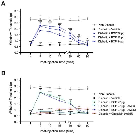 Effects of localized β-Caryophyllene (BCP) injections on mechanical allodynia in diabetic mice. (A) Dose-dependent effects of intraplantar (i.pl.) administration of BCP (8, 18, and 27 µg) on paw withdrawal thresholds in diabetic mice. Paw withdrawal thresholds were measured over 90 min post-BCP injection on day 14 after STZ injection. *** p < 0.001 compared to non-diabetic controls; ~~~ p < 0.001 compared to diabetic controls; ns indicates no significant difference compared to diabetic controls. (B) Effects of CB receptor antagonists on BCP (27 µg)-induced alleviation of mechanical allodynia. Diabetic mice were pretreated with AM630 (CB2 antagonist) or AM251 (CB1 antagonist) 30 min before BCP injection. As a positive control, mice were treated with a topical analgesic cream containing capsaicin 0.075%. Data are presented as mean ± SEM (n = 8 per group). Statistical analysis: two-way ANOVA with Tukey’s post-hoc test. ns, not significant, *** p < 0.001, compared to diabetic controls; ns indicates no significant difference compared to diabetic controls; ~~~ p < 0.001 compared to BCP (27 µg)-treated diabetic mice. Statistical analysis: two-way ANOVA with Tukey’s post-hoc test.