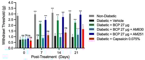 Fourteen days after STZ injection, hyperglycemic mice were randomly allocated into eight experimental groups (n = 8 per group) using a randomized block design. At this stage, diabetic mice exhibited clinical features consistent with DPN, including hyperglycemia and mechanical hypersensitivity. The experimental groups included a vehicle control group (diabetic) that received i.pl. injections of the vehicle. In this study, the vehicle control group received intraplantar injections of the BCP vehicle (90% saline, 5% DMSO, 5% Kolliphor), which was required for BCP solubilization. A separate saline-only control group was not included as the vehicle was predominantly saline-based. Three BCP treatment groups received intraplantar (i.pl.) injections of BCP at doses of 9, 18, or 27 µg, respectively. These doses were selected based on previous studies demonstrating the efficacy of BCP in neuropathic pain models []. Two combination treatment groups were administered 27 µg BCP i.pl. along with either 12 µg AM251 (CB1 receptor antagonist) or 4 µg AM630 (CB2 receptor antagonist) []. A control group received topical analgesic cream with capsaicin 0.075% (Zostrix® HP). This randomization ensured equal distribution of treatment conditions and maintained experimental consistency. Non-diabetic mice were i.pl. injected within the vehicle alone. BCP treatments were administered daily for 21 days, starting 14 days post-STZ injection.