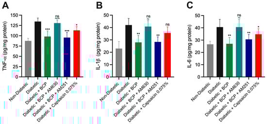 Topical capsaicin cream (0.075%) reduced TNF-α and IL-6 levels (p < 0.05) but was less effective than BCP (27 µg). Notably, capsaicin cream had no significant effect on IL-1β levels. These results highlight BCP’s ability to selectively modulate pro-inflammatory cytokines involved in DPN progression. Its efficacy, primarily mediated through CB2 receptor activation, underscores its potential to mitigate neuroinflammation in hind paw skin tissues and improve outcomes in diabetic neuropathy.
