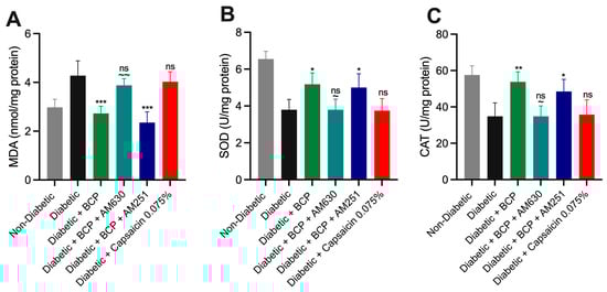 Oxidative stress plays a critical role in tissue damage and the progression of DPN, as evidenced by increased lipid peroxidation and impaired antioxidant defenses. The effect of BCP on oxidative stress in hind paw skin tissues was assessed by measuring MDA, a marker of lipid peroxidation, and the activities of antioxidant enzymes SOD and CAT (Figure 7A–C). STZ-induced diabetic mice exhibited a significant increase in MDA levels (p < 0.001) alongside notable reductions in SOD (p < 0.05) and CAT (p < 0.01) activities compared to non-diabetic controls, indicating heightened oxidative stress. Chronic topical BCP administration (27 µg for 21 days) significantly reduced MDA levels while restoring SOD and CAT activities (p < 0.05) relative to vehicle-treated diabetic mice. The involvement of CB2 receptors in mediating BCP’s antioxidative effects was confirmed by pretreatment with the CB2 receptor antagonist AM630, which significantly reversed these effects (p < 0.05). In contrast, the CB1 receptor antagonist AM251 had no significant impact, underscoring the specificity of CB2 receptor activation. Topical capsaicin cream (0.075%) did not influence oxidative stress biomarkers, showing no effect on MDA levels or SOD and CAT activities. These findings demonstrate that topical BCP treatment effectively mitigates oxidative damage in hind paw skin tissues of STZ-induced DPN mice, primarily through CB2 receptor activation, highlighting its potential as a targeted therapeutic strategy for DPN.