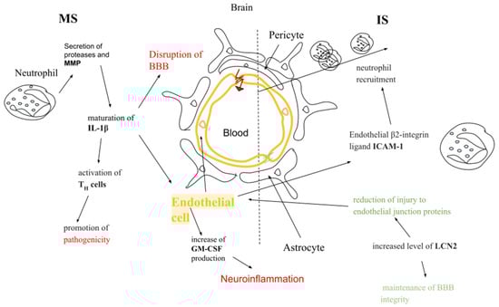 Figure 1. Comparison of interaction between neutrophils and endothelial cells in the pathogenesis of multiple sclerosis (MS) and ischemic stroke (IS). MMP—matrix metalloproteinases, BBB—blood–brain barrier, GM-CSF—granulocyte macrophage colony-stimulating factor, ICAM-1—intercellular adhesion molecule 1, LCN-2—lipocalin 2. Green text—protective effect, red text—detrimental effect.