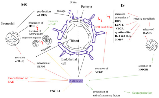 Figure 2. Comparison of interaction between neutrophils and astrocytes in the pathogenesis of MS and IS. ROS—reactive oxygen species, EAE—experimental autoimmune encephalomyelitis, NLRP3 -Nod-like receptor containing pyrin domain 3, VEGF—vascular endothelial growth factor, DAMPs—damage-associated molecular patterns, HMGB1—high-mobility group box 1. Green lines—protective effect, red lines—detrimental effect, yellow lines—CXCL1 effect.