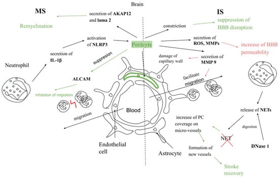 Figure 3. Comparison of interaction between neutrophils and pericytes (PC) in the pathogenesis of MS and IS. AKAP12—A-kinase anchor protein 12, lama 2—laminin subunit alpha 2, ALCAM—activated leukocyte cell adhesion molecule, NETs—neutrophil extracellular traps, DNase 1—deoxyribonuclease I. Green lines—protective effect, red lines—detrimental effect.