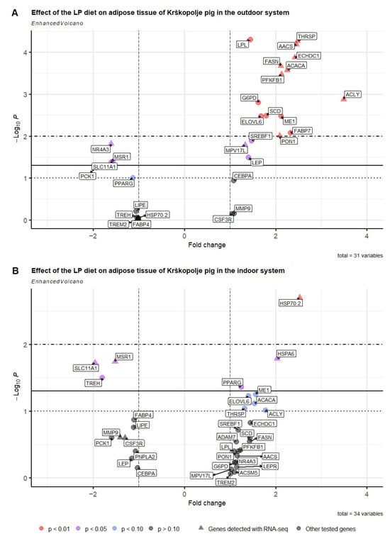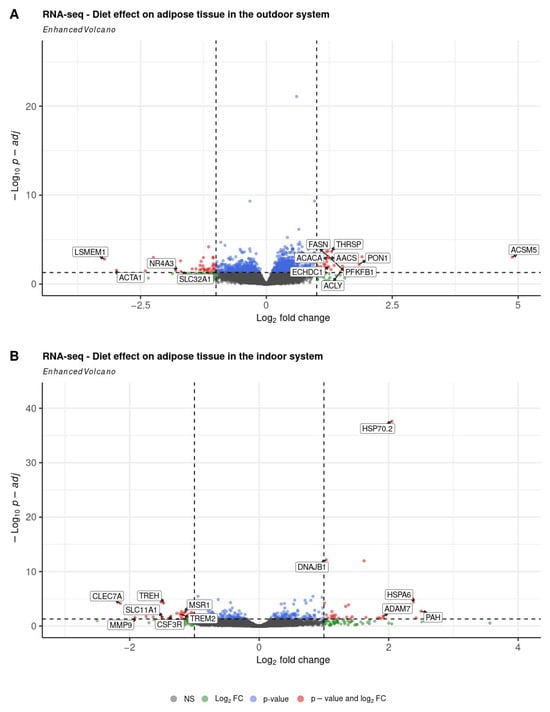 Volcano plots depicting genes expressed in the subcutaneous adipose tissue from pigs receiving low-protein (LP) vs. control high-protein diet (HP) in the (A) outdoor and (B) indoor systems. The horizontal lines indicate the significance threshold of differentially expressed genes at a p-value of 0.05. The vertical lines represent the threshold of |log2 (fold change)| > 1. Genes upregulated in the LP compared to HP group have log2(fold change) > 1, while downregulated genes have log2 (fold change) < −1.