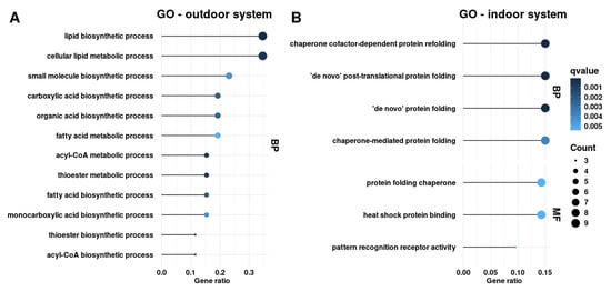 The gene ontology (GO) over-representation analysis of differentially expressed genes in the subcutaneous adipose tissue from pigs fed a low-protein (LP) versus control high-protein (HP) diet in the (A) outdoor and (B) indoor systems. GO analysis represents the biological process category (BP) and molecular function category (MF). The gene ratio refers to the proportion of differentially expressed genes relative to the total number of genes associated with a given GO term.