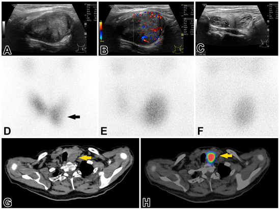 Neck ultrasound revealed (A) a large, hypoechoic, slightly irregularly shaped but sharply contoured, heterogeneous, solid nodule in the caudal half of the left thyroid lobe (EU-TIRADS 3); (B) the nodule exhibited enhanced central and peripheral vascularization; and (C) there were several smaller EU-TIRADS 2 nodules in the right lobe, displaying purely spongiform structures. Thyroid scintigraphy (D) showed a contour-deforming activity defect in the middle lower third of the left lobe, corresponding to a cold nodule (arrow). Parathyroid scintigraphy demonstrated a 99mTc-MIBI-enriched nodule in the left lobe corresponding to a large parathyroid neoplasm. (E) The early phase (10 min) and (F) late phase (120 min) parathyroid SPECT/CT. (G) Axial slices of native (low-dose) CT images show an inhomogeneous hypodense lesion of 40 × 32 mm2 axial diameter in the lower half of the left thyroid lobe, not sharply demarcated from it, with a dislocation of the trachea to the right (yellow arrow). (H) The marked lesion displays an intensely enhanced radiopharmaceutical uptake in SPECT/CT fused images.