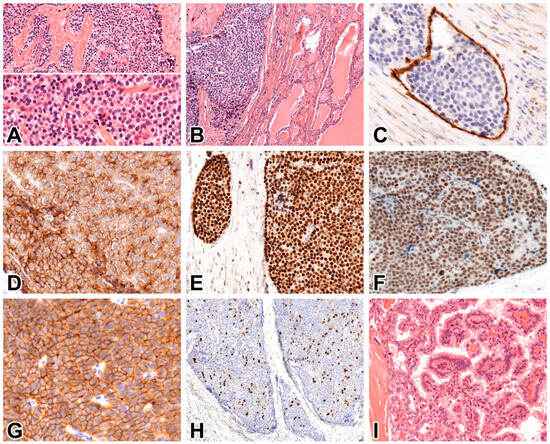 The genetic profiling in our case did not reveal any CDC73 mutations or loss of heterozygosity, and parafibromin was diffusely expressed immunohistochemically in the nuclei of tumor cells. Furthermore, no mutations were found in the CCND1 or PIK3CA genes. The CDH1, TP53, and RB genes were likewise not mutated, and the corresponding immunostainings exhibited normal membranous expression or wild-type patterns. CDH1 regulates cell–cell adhesion and inhibits cell proliferation and invasion, TP53 prevents the propagation of genetically defective cells and maintains genomic stability, and RB is a negative regulator of cell-cycle progression. Their biallelic loss favors a more aggressive clinical course [40].