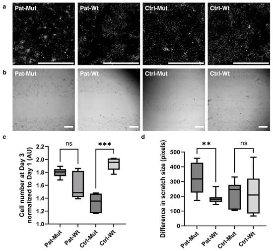 In our previous publication [], we focused on hippocampal neurons derived from iPSCs of a schizophrenic patient carrying a de novo mutation in the ZMYND11 gene. We examined NPCs only at the mRNA level, where we found significant differences between mutant and wild-type NPCs, particularly concerning cell adhesion processes. Therefore, we decided it worthwhile to examine these NPCs in more detail. Cell adhesion affects cell migration and division, so we first examined NPCs in a 2D model with a cell proliferation assay and a wound healing assay. We differentiated four types of iPSCs (Pat-Mut, which originated from a schizophrenic patient, Pat-Wt, where the patient’s de novo mutation in the ZMYND11 gene was corrected, and an independent healthy control cell (Ctrl-Wt) or its ZMYND 11 mutant version (Ctrl-Mut) into hippocampal NPCs (see methods for details). The NPCs were seeded into polyornithine-laminin-coated plates, one part was allowed to divide, the other part was allowed to be almost confluent and then scratched. The endpoint of the proliferation assay was day 3 (Figure 1a), as after that the cultures became so dense that we could not reliably evaluate the data with the analysis programme. The scratch assay was evaluated after 24 h, as in several cases the scratch was closed in the 48 h samples (indicating efficient migration and proliferation of NPCs) (Figure 1b and Supplementary Figure S1). No significant difference was found in cell division between patient-derived cells, while in the case of control-derived cells, Ctrl-Mut NPCs grew more slowly than Ctrl-Wt (Figure 1c). In the case of scratch closure, the control-derived cells showed no difference, but the Pat-Mut cell line closed the wound significantly faster than the Pat-Wt line (Figure 1d).