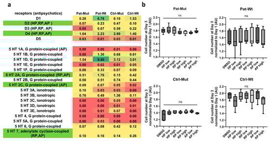 According to our previous findings, using hippocampal NPCs obtained from fibroblast-derived iPSCs [], the lack of significant differences in cell numbers following antipsychotic treatment was expected. Receptor expression in these NPCs mirrors was previously reported in vitro human data [,]. In the hippocampal NPCs studied here, although D4 expression predominates, D2 expression is also present, and 5HT 2A, 5HT 2C, and 5HT 7 serotonin receptors are also expressed among the receptors affected by antipsychotics. In 6-week-old neurons differentiated from NPCs, the receptor distribution is similar (Supplementary Figure S2), with some receptor subtypes (such as 5 HT 1E or 5 HT 5A) being expressed only in neurons. In general, the expression level in neurons is higher than in the progenitor state, which may reflect the maturation process. The toxicity observed in previous publications (in the case of HP and RP) may be due to the different cell type, antipsychotic concentration, or measurement technique.