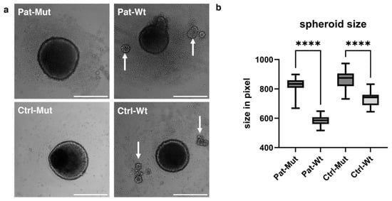 Given that NPCs reside in a three-dimensional environment in vivo, we sought to investigate their behaviour within a 3D context. To this end, we cultured the NPCs into spheroids to better mimic their native conditions, using progenitor-specific medium (NPC medium) to prevent differentiation into neurons. When an equal number of NPCs were plated on the ultra-low attachment (ULA) plate, a significant difference in the size of mutant and wt spheroids was observed already at this stage (Figure 3a). When the spheroids were measured on day 3, regardless of the overall genetic background, the mutant spheroids were significantly larger than their wt counterparts (Figure 3b). This may be at least partly because the spheroids derived from the NPCs carrying the mutation organized into a single spheroid, while smaller, separate clumps often appeared next to the wt spheroids (Figure 3a, white arrows). When quantified, the number of separate clumps was five vs. 91 between Ctrl-Mut and Ctrl-Wt, and 0 vs. 73 between Pat-Mut and Pat-Wt.