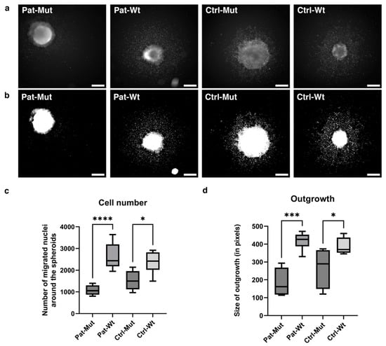 After three days in suspension culture, the spheroids were transferred to polyornithine-laminin-coated plates for attachment. Further, when the spheroids were maintained in NPC medium, a clear difference was observed between the mutant and wt spheroids on day 3 after attachment (Figure 4a,b). Both the number of cells spreading from the spheroids and the extent of outgrowth were significantly reduced in the mutant spheroids when compared to their wt counterparts (Figure 4c,d).