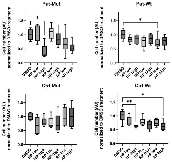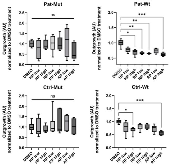 When the adherent spheroids were treated with antipsychotics for 3 days (Figure 5 and Figure 6), we found that in both Ctrl-Wt and Pat-Wt, all treatments reduced the number of cells spreading from the spheroids and the size of the outgrowth. In the case of NPCs differentiated from patients (Pat-Mut), high concentrations of HP significantly reduced the number of cells spreading from the spheroids. Certain treatment conditions, although not reaching statistical significance, resulted in an increased number of cells spreading from the spheroids (e.g., low concentrations of RP, as shown in Figure 5) or an increase in the size of the outgrowth (e.g., low concentrations of AP, as depicted in Figure 6).