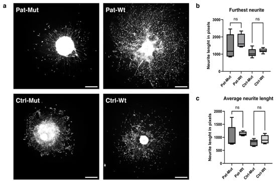 Characterization of the outgrowth of differentiating spheroids. (a) Representative pictures of differentiating spheroids. The cells were stained with Calcein-AM. The scale bars represent 500 µm. (b,c) Statistical analysis of spheroid outgrowth on the 4th day after attachment (see Section 4 for details). The characteristics of neurite length are shown in pixels as average ± SD. n = 4–6 analyzed by Kruskal–Wallis test, Dunn’s multiple comparisons test, ns = non-significant