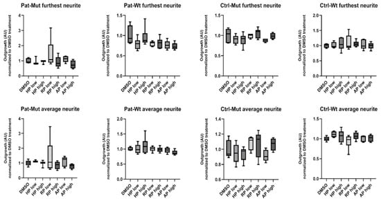 Unfortunately, the available analysis programmes were not suitable for quantifying this phenotypic difference, and the features that we finally used (the furthest outgrowth distance and the average outgrowth distance) showed no difference between the untreated (Figure 7b,c) and treated cells (Figure 8).