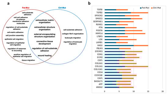 Our previous publication [] presented mRNA sequencing data for the same NPCs, revealing that in mutant NPCs, underexpressed genes were associated with the extracellular matrix, cell adhesion, and cell–extracellular matrix connection terms, according to Gene Ontology (GO) enrichment analysis. Indeed, in spheroids maintained in NPC medium, both the number of spreading cells and the extent of outgrowth were significantly reduced in mutant spheroids, compared to their wild-type counterparts (Figure 4c,d). The observed phenomenon may be attributed to the reduced cell adhesion and migration capacity of the NPCs in mutant spheroids. To further analyze this observation, we plotted the GO terms appearing in Pat-Mut and Ctrl-Mut NPCs in a Venn diagram (Figure 9a). In addition to the common intersection, more GO terms appear in patient-derived NPCs, indicating that the reduced migration capacity observed here is not exclusively caused by the ZMYND11 mutation. The most frequently occurring genes in GO terms are TGFB2, COL1A1, MMP14, and HAS2, all of which are related to cell adhesion and cell migration (Figure 9b). Underexpression of these genes may greatly affect cell–cell and cell–matrix interactions.