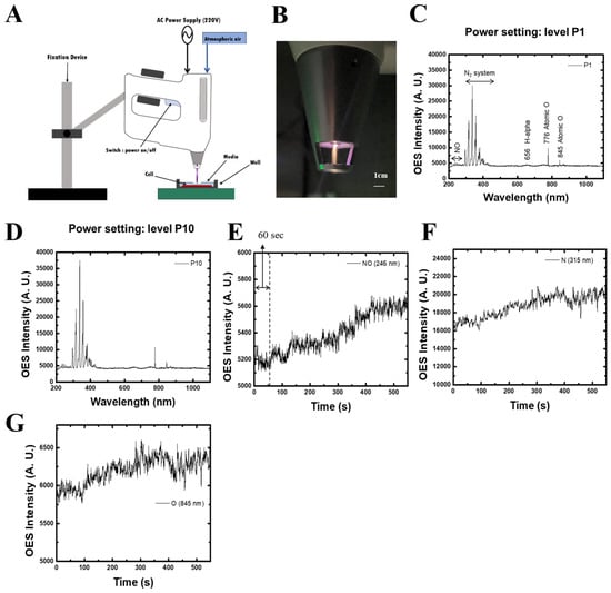 Schematic representation and characterization of the NTP device. (A) Schematic diagram illustrating the non-thermal plasma (NTP) generation system, including the optical emission spectrometer (OES) setup and the atmospheric air plasma jet system. The system operates under atmospheric conditions to produce NTP for experimental applications. (B) Photograph of the NTP device generating plasma. (C) Optical emission spectrum (OES) intensity measured at a power setting of P1. (D) OES intensity at a higher power setting (P10). (E–G) Temporal dynamics of reactive species generated during plasma discharge. (E) Nitric oxide (NO) emission intensity at 246 nm over time. (X-axis: time [seconds], Y-axis: emission intensity [arbitrary units]). (F) Nitrogen (N) emission at 315 nm and (G) atomic oxygen (O) emission at 845 nm showing time-dependent emission intensity (X-axis: time [seconds], Y-axis: emission intensity [arbitrary units]).