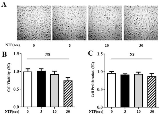 Effect of NTP on HUVEC viability and proliferation. (A) Representative photomicrographs of human umbilical vein endothelial cells (HUVECs) treated with NTP for 0, 3, 10, or 30 s. Images were acquired from the center of the NTP-treated spots following 12 h incubation. (B) Cell viability, expressed as fold change relative to untreated controls, assessed by MTT assay. (C) Cell proliferation, measured by CCK-8 assay. Data are presented as individual values with the mean ± SD from three independent experiments. No statistically significant differences (NS) were observed among groups.